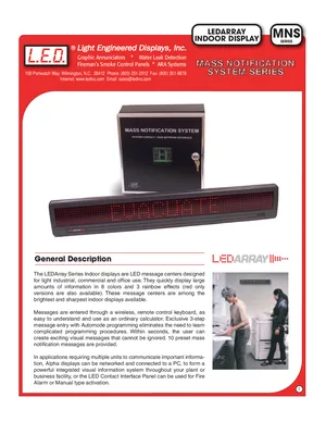 Installation and Programming Manual for the Light Engineered Displays LEDArray Series Indoor Displays. 15 models including LEDArray, MNS Series, MNS-ctrl and 12 additional variants. Hardware mounting and wiring instructions alongside detailed system programming and configuration.