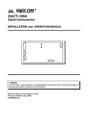 Installation and Operations Manual for the Mircom DACT-100A, published in 2005. Document No: LT-639, Rev: 12. Model DACT-100A. System installation procedures and daily operating instructions.