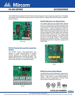 Datasheet for the Mircom FA-260 Series Accessories. Document No: 5684, Rev: 2. 6 models including UDACT-286, PR-281, RM-263 and 3 additional variants. Detailed technical specifications, electrical ratings, and agency listings.