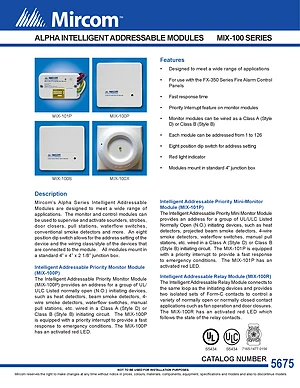 Datasheet for the Mircom MIX-100 Series. Document No: 5675, Rev: 3. 5 models including MIX-100P, MIX-101P, MIX-100R and 2 additional variants. Engineering specifications, wiring diagrams, and mounting dimensions.