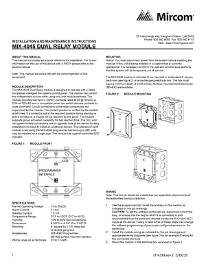 Installation Manual for the Mircom MIX-4045, published in 2025. Document No: LT-6143, Rev: 2. Model MIX-4045. Hardware installation, terminal connections, and environmental requirements.