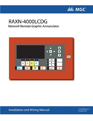 Installation Manual for the Mircom RAXN-4000LCDG, published in 2021. Document No: LT-6033MP, Rev: 0. Model RAXN-4000LCDG. Mounting instructions, wiring diagrams, and system power-up procedures.