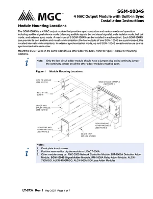 Installation Manual for the Mircom SGM-1004S, published in 2025. Document No: LT-6734, Rev: 1. Model SGM-1004S. Mounting instructions, wiring diagrams, and system power-up procedures.