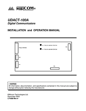 Installation and Operations Manual for the Mircom UDACT-100A, published in 2003. Document No: LT-688, Rev: 4. Model UDACT-100A. Hardware mounting, wiring, and user system management.