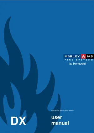 User Guide for the Morley-IAS DX Series, published in 2003. Document No: 996-148-000-5, Rev: 5. 10 models including DX1e-20S, DX1e-40M, DX2e-40M and 7 additional variants. Operator guide, alarm response procedures, and system status monitoring.