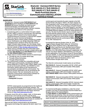 Installation Manual for the Napco SLE-MAXA/SLE-MAXV, published in 2022. Document No: WI2467.aLF. 4 models including SLE-MAXA-C, SLE-MAXA-Z, SLE-MAXV-C and 1 additional variants. Physical installation guide, backbox dimensions, and cabling specifications.