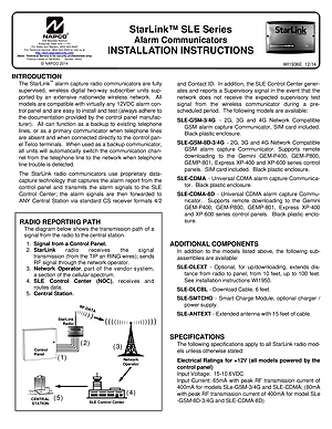 Installation Manual for the Napco SLE Series Alarm Communicators, published in 2014. Document No: WI1936E. 4 models including SLE-GSM-3/4G, SLE-GSM-8D-3/4G, SLE-CDMA and 1 additional variants. Hardware installation, terminal connections, and environmental requirements.