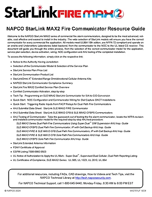Manual for the Napco StarLink MAX2 Fire Communicators Resource Guide, published in 2024. Document No: WI2751LF. Models SLE-MAX2-FIRE, SLE-MAX2-CFB and SLE-MAX2-CFBPS. System overview, features and capabilities, and basic operation.