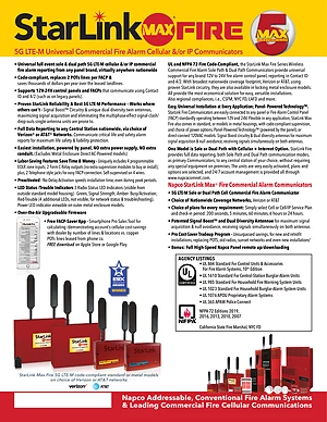 Datasheet for the Napco StarLink Max Fire Communicators, published in 2024. Document No: A823A. 6 models including SLE-MAXAI-FIRE, SLE-MAXVI-FIRE, SLE-MAXAI-CFB and 3 additional variants. Detailed technical specifications, electrical ratings, and agency listings.