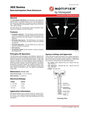 Datasheet for the Notifier 302 Series, published in 2008. Document No: dn-1271, Rev: A1. 13 models including 302, 302-AW, 302-EPM and 10 additional variants. Detailed technical specifications, electrical ratings, and agency listings.