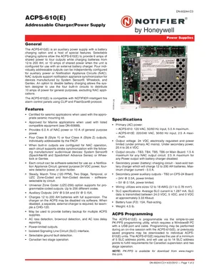 Datasheet for the Notifier ACPS-610, published in 2012. Document No: DN-60244, Rev: C3. 20 models including ACPS-610, ACPS-610E, CHG-120 and 17 additional variants. Product features, environmental operating limits, and compatibility data.
