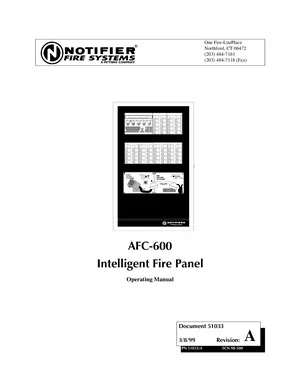Operations Manual for the Notifier AFC-600, published in 1999. Document No: 51033, Rev: A. 42 models including AFC-600, AFP-600, AMG-1 and 39 additional variants. User interface controls, event handling, and routine maintenance tasks.