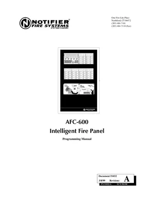 Programming Manual for the Notifier AFC-600, published in 1999. Document No: 51032, Rev: A. 27 models including AFC-600, FSI-751, FSP-751 and 24 additional variants. System configuration, zone programming, and cause-and-effect logic.