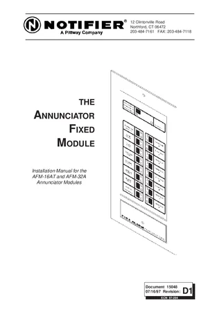 Installation and Operations Manual for the Notifier AFM-16AT and AFM-32A, published in 1997. Document No: 15048, Rev: D1. 8 models including AFM-16AT, AFM-32A, ABS-1 and 5 additional variants. Hardware mounting, wiring, and user system management.