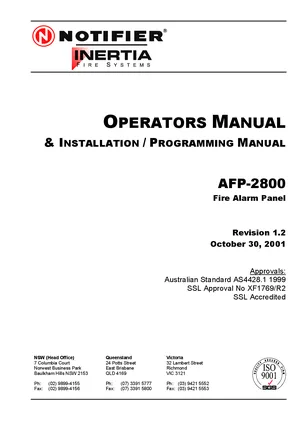 Installation, Operations, and Programming Manual for the Notifier AFP-2800, published in 2001. Rev: 1.2. 39 models including AFP-2800, DFP-2800, AFP2800 and 36 additional variants. Complete system installation, daily operation procedures, and detailed programming configurations.
