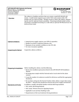 Installation Manual for the Notifier AFP-300/AFP-400 Cabinets, published in 1997. Document No: 50392, Rev: B. 6 models including AFP-300, AFP-400, AA Series and 3 additional variants. Hardware installation, terminal connections, and environmental requirements.