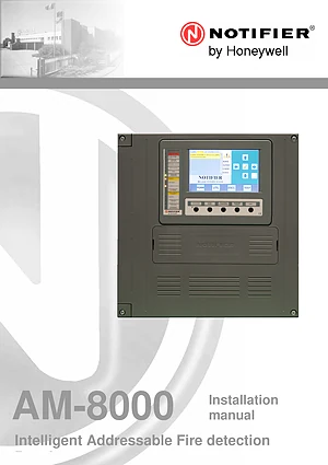 Installation Manual for the Notifier AM-8000. Document No: 160.1-AM8000-ITA, Rev: A.3. Model AM-8000. Physical installation guide, backbox dimensions, and cabling specifications.