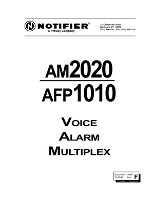 Installation, Operations, and Programming Manual for the Notifier AM2020 and AFP1010 Voice Alarm Multiplex, published in 1997. Document No: 15889, Rev: F. 27 models including AM2020, AFP1010, AMG-1 and 24 additional variants. Hardware installation, alarm/fault management, and advanced system configuration.