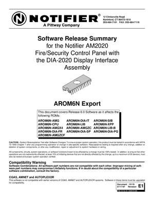 Technical Reference Manual for the Notifier AM2020 Software Release Summary, published in 1997. Document No: 15119, Rev: E1. 15 models including AM2020, DIA-2020, AROM6N-AMG and 12 additional variants. Comprehensive system reference, electrical characteristics, and interface details.