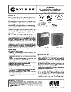 Datasheet for the Notifier AS and AH Series Audible Devices, published in 2004. Document No: DN-5566, Rev: J-122. 17 models including AS-24MCW, AS-24MCW-FR, AS-24MCW-FW and 14 additional variants. Engineering specifications, wiring diagrams, and mounting dimensions.
