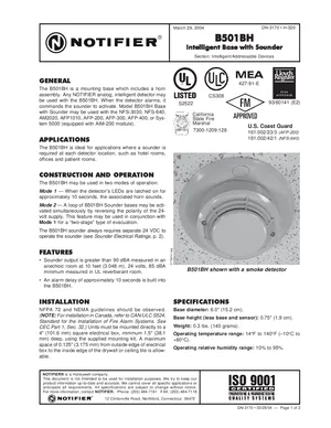 Datasheet for the Notifier B501BH, published in 2004. Document No: DN-3170. Models B501BH and B501. Product features, environmental operating limits, and compatibility data.