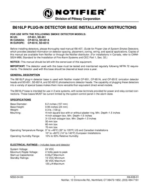 Installation Manual for the Notifier B616LP, published in 1993. Document No: I56-636-01, Rev: 01. 7 models including B616LP, CP-651, SD-651 and 4 additional variants. Hardware installation, terminal connections, and environmental requirements.