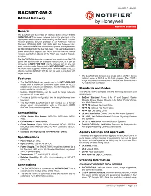 Datasheet for the Notifier BACNET-GW-3, published in 2014. Document No: DN-6877, Rev: C. 14 models including BACNET-GW-3, NFS-320, NFS2-640 and 11 additional variants. Detailed technical specifications, electrical ratings, and agency listings.