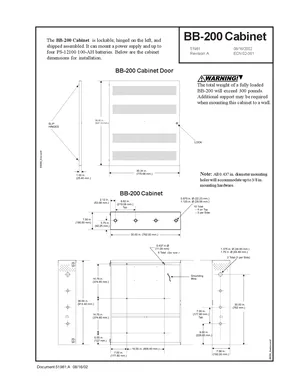 Installation Manual for the Notifier BB-100 and BB-200, published in 2002. Document No: 51981, Rev: A. Models BB-100, BB-200 and PS-12100. Physical installation guide, backbox dimensions, and cabling specifications.