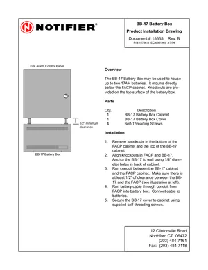 Installation Manual for the Notifier BB-17, published in 1994. Document No: 15535, Rev: B. Model BB-17. Mounting instructions, wiring diagrams, and system power-up procedures.