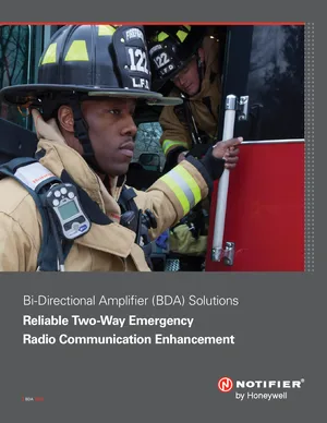 Brochure for the Notifier BDA, published in 2018. Document No: NF_BR_Bi-DirectionalAmp, Rev: 04. Model BDA. Product highlights, key features, and application overview.
