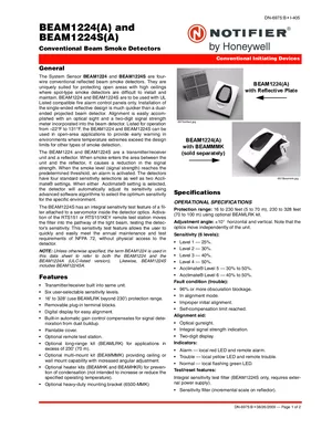 Datasheet for the Notifier BEAM1224 and BEAM1224S, published in 2009. Document No: DN-6975, Rev: B. 15 models including BEAM1224, BEAM1224A, BEAM1224S and 12 additional variants. Engineering specifications, wiring diagrams, and mounting dimensions.