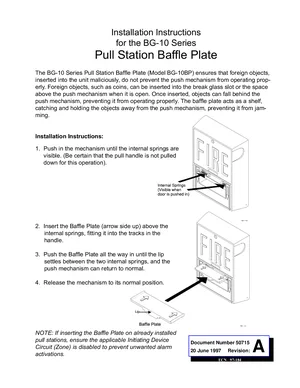 Installation Manual for the Notifier BG-10 Series, published in 1997. Document No: 50715, Rev: A. Models BG-10 and BG-10BP. Hardware installation, terminal connections, and environmental requirements.