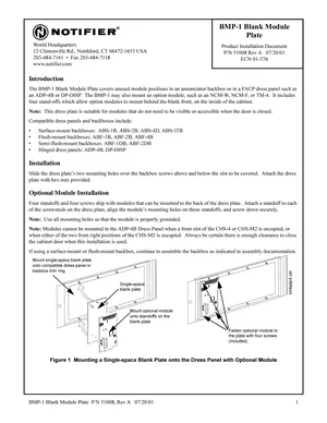 Installation Manual for the Notifier BMP-1, published in 2001. Document No: 51008, Rev: A. 17 models including BMP-1, ABS-1B, ABS-2B and 14 additional variants. Hardware installation, terminal connections, and environmental requirements.