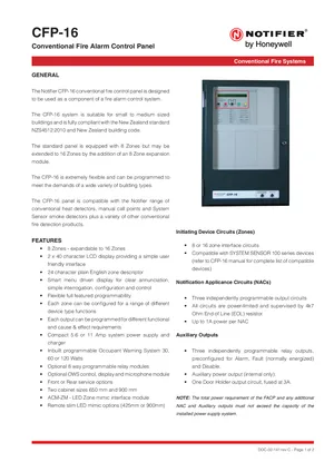 Datasheet for the Notifier CFP-16, published in 2014. Document No: DOC-02-141, Rev: C. 14 models including CFP-16, CFP-16/650-8Z-PS5, CFP-16/900-8Z-PS5 and 11 additional variants. Engineering specifications, wiring diagrams, and mounting dimensions.