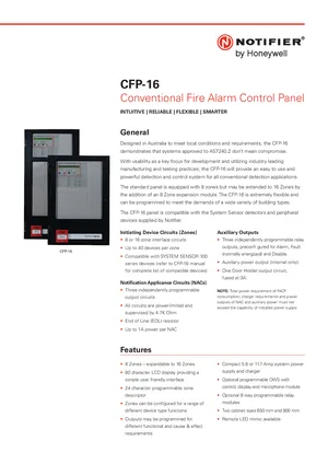 Datasheet for the Notifier CFP-16 (AU), published in 2018. Document No: DOC-02-150, Rev: E. 39 models including CFP-16, CFP-16/650-8Z-PS5, CFP-16/650-8Z-PS11 and 36 additional variants. Detailed technical specifications, electrical ratings, and agency listings.