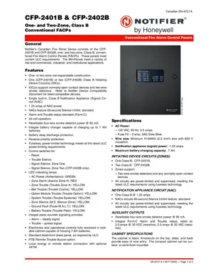 Datasheet for the Notifier CFP-2401B and CFP-2402B (Canadian), published in 2009. Document No: DN-6727, Rev: A. 9 models including CFP-2401B, CFP-2402B, TR-3-G and 6 additional variants. Detailed technical specifications, electrical ratings, and agency listings.