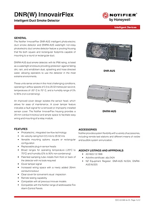 Datasheet for the Notifier DNR(W) InnovairFlex, published in 2015. Document No: DOC-02-098, Rev: B. Models DNR-AUS and DNRW-AUS. Engineering specifications, wiring diagrams, and mounting dimensions.