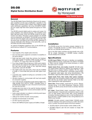 Datasheet for the Notifier DS-DB, published in 2014. Document No: DN-60565, Rev: B. 12 models including DS-DB, DS-AMP, DS-AMPE and 9 additional variants. Detailed technical specifications, electrical ratings, and agency listings.