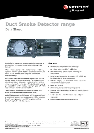 Datasheet for the Notifier Duct Smoke Detector range, published in 2010. Document No: 990-141, Rev: 1110. Models D2E and DNRE. Product features, environmental operating limits, and compatibility data.