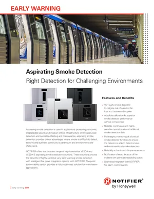 Brochure for the Notifier Early Warning Detection, published in 2019. Document No: NF_SS_EarlyWarning, Rev: 01. Models VESDA, VESDA-E and OSID. Product highlights, key features, and application overview.