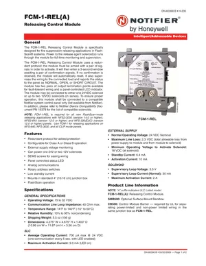Datasheet for the Notifier FCM-1-REL, published in 2009. Document No: DN-60390, Rev: B. 4 models including FCM-1-REL, FCM-1-RELA, SMB500 and 1 additional variants. Engineering specifications, wiring diagrams, and mounting dimensions.