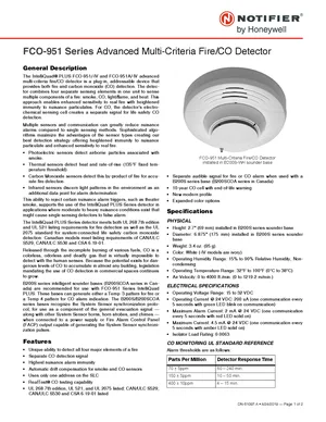 Datasheet for the Notifier FCO-951 Series, published in 2019. Document No: DN-61097, Rev: A. 30 models including FCO-951, FCO-951-IV, FCO-951A and 27 additional variants. Product features, environmental operating limits, and compatibility data.