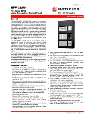 Datasheet for the Notifier FireVoice-25/50 Voice Evacuation Panel, published in 2010. Document No: DN-7004, Rev: A1. 6 models including NFV-25/50, ACC-AAM25, FC-XRM70 and 3 additional variants. Detailed technical specifications, electrical ratings, and agency listings.