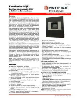 Datasheet for the Notifier FireWarden-50, published in 2011. Document No: DN-7102, Rev: E. 54 models including FireWarden-50, FireWarden-50E, NFW-50 and 51 additional variants. Product features, environmental operating limits, and compatibility data.