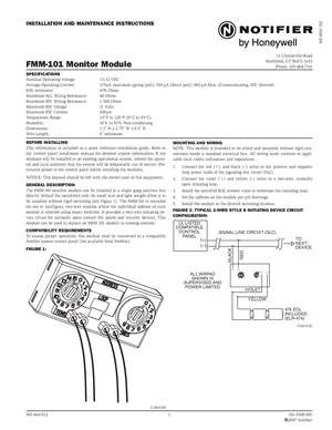 Installation Manual for the Notifier FMM-101, published in 2007. Document No: I56-3508-001. Models FMM-101 and MMX-101. Hardware installation, terminal connections, and environmental requirements.