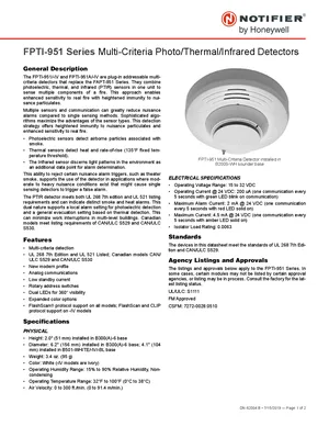 Datasheet for the Notifier FPTI-951 Series, published in 2019. Document No: DN-62004, Rev: B. 5 models including FPTI-951, FPTI-951-IV, FPTI-951A and 2 additional variants. Product features, environmental operating limits, and compatibility data.