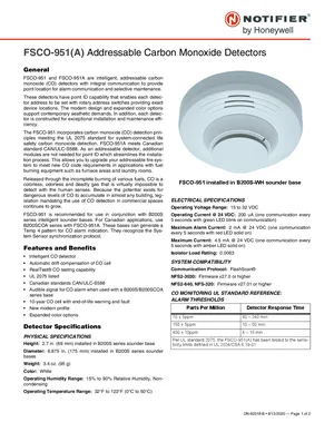 Datasheet for the Notifier FSCO-951, published in 2020. Document No: DN-62018, Rev: B. 34 models including FSCO-951, FSCO-951A, B200S and 31 additional variants. Detailed technical specifications, electrical ratings, and agency listings.