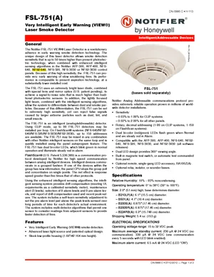 Datasheet for the Notifier FSL-751, published in 2012. Document No: DN-6886, Rev: C. 24 models including FSL-751, FSL-751A, B210LP and 21 additional variants. Product features, environmental operating limits, and compatibility data.