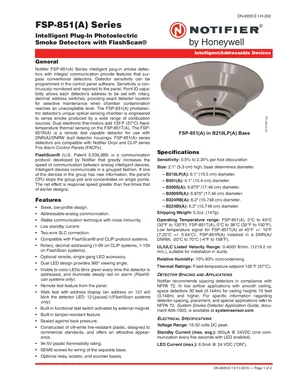 Datasheet for the Notifier FSP-851 Series Detectors, published in 2015. Document No: DN-6935, Rev: E. 33 models including FSP-851, FSP-851A, FSP-851T and 30 additional variants. Engineering specifications, wiring diagrams, and mounting dimensions.