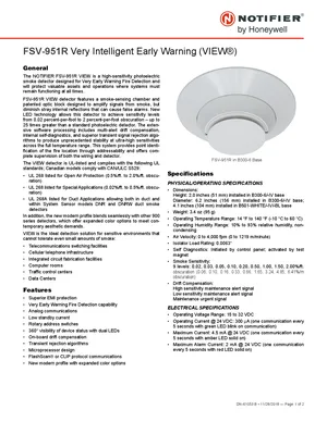 Datasheet for the Notifier FSV-951R, published in 2018. Document No: DN-61053, Rev: B. 45 models including FSV-951R, FSV-951R-IV, FSV-951RA and 42 additional variants. Product features, environmental operating limits, and compatibility data.